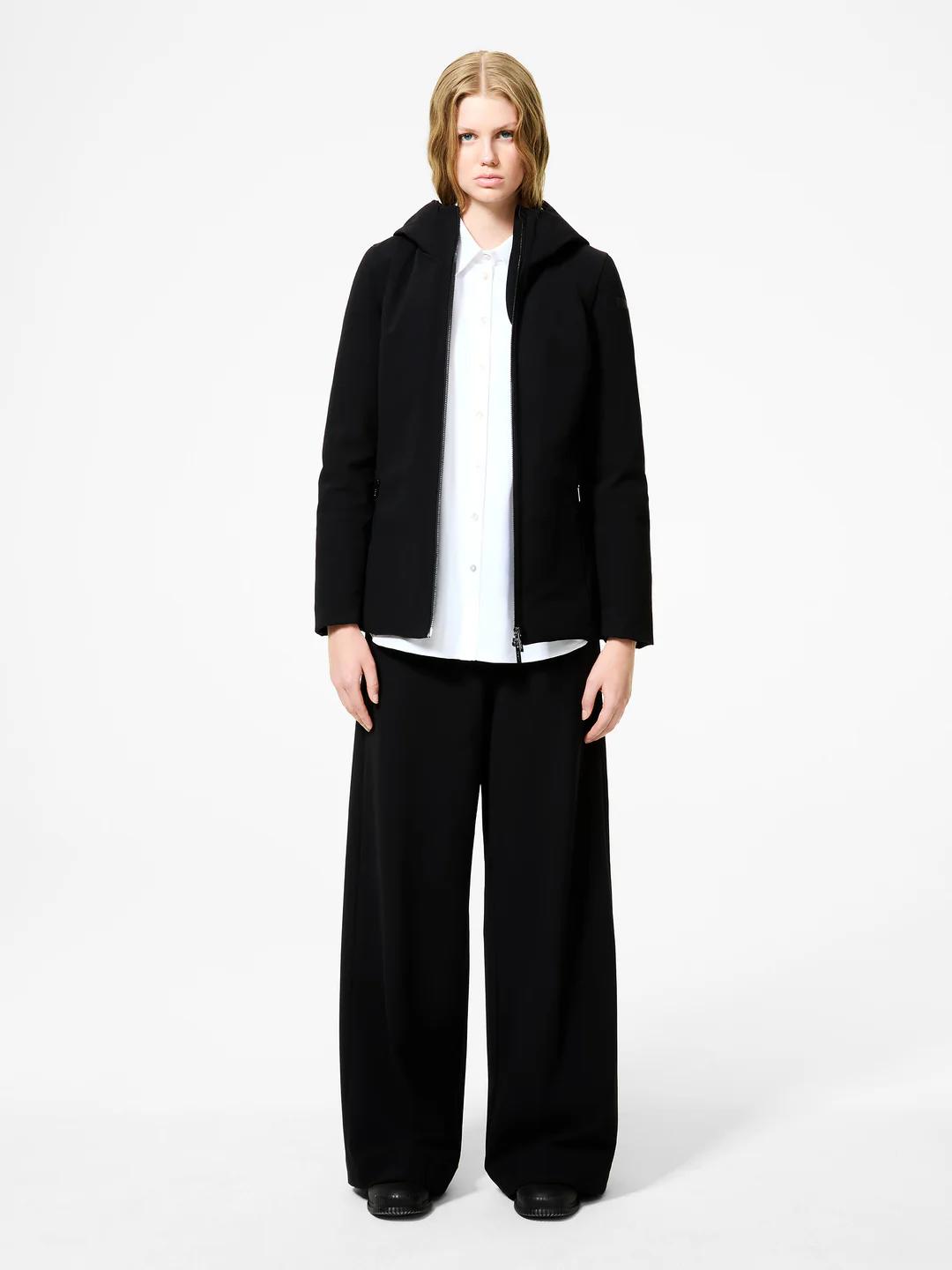 Un capo indispensabile nel guardaroba invernale, la giacca è realizzata nel tessuto a membrana Stratofabric #3 impermeabile e traspirante. L’esterno nell’esclusivo SURFLEX® conferisce un finish super opaco, che ne esalta il design nitido e minimalista. L’imbottitura del capo in piuma d’anatra 90/10 è contenuta nei canali tubici, che prevengono l’uscita della piuma garantendo un calore avvolgente e una leggerezza di indosso unica. Il cappuccio avvolgente, la vestibilità confortevole e la leggera sciancratura in vita valorizzano delicatamente il look femminile del capospalla.