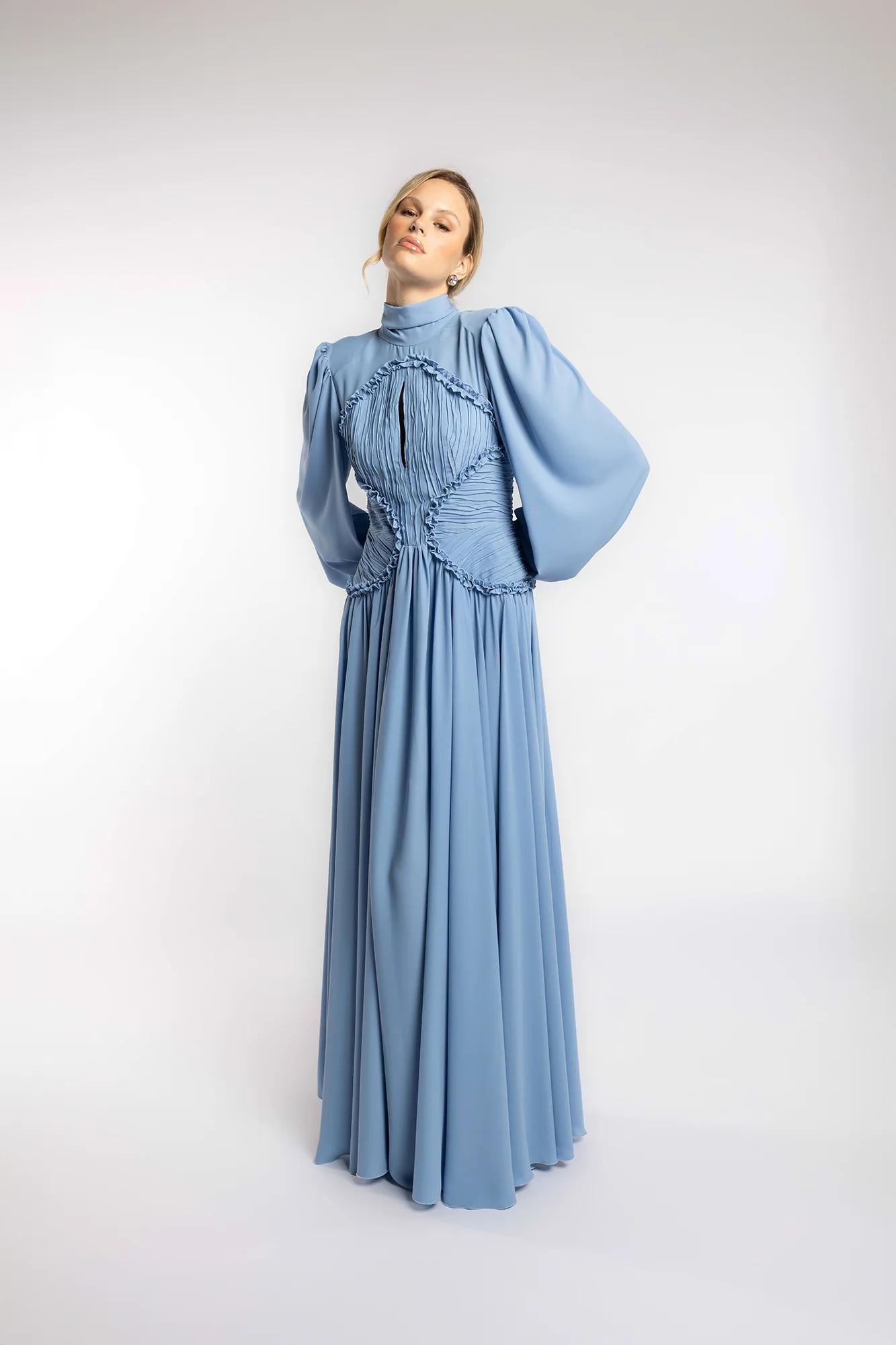 Le maniche morbide e il collo alto evocano una regalitร contemporanea, mentre il lungo fiocco posteriore scivola con grazia, accompagnando ogni movimento con poetica leggerezza.
