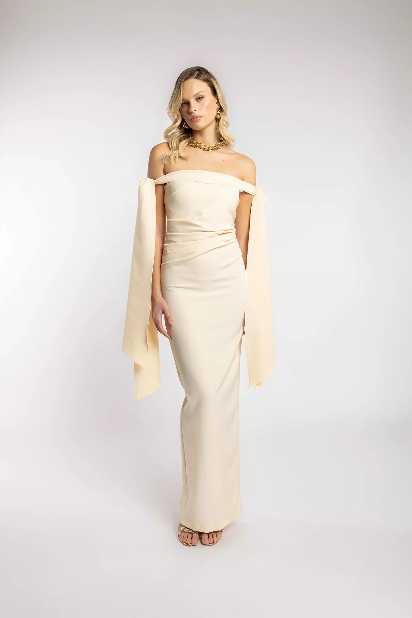Lo scollo off-shoulder valorizza spalle e décolleté con raffinata delicatezza, mentre il drappeggio in vita scolpisce la silhouette creando proporzioni armoniose e femminili.